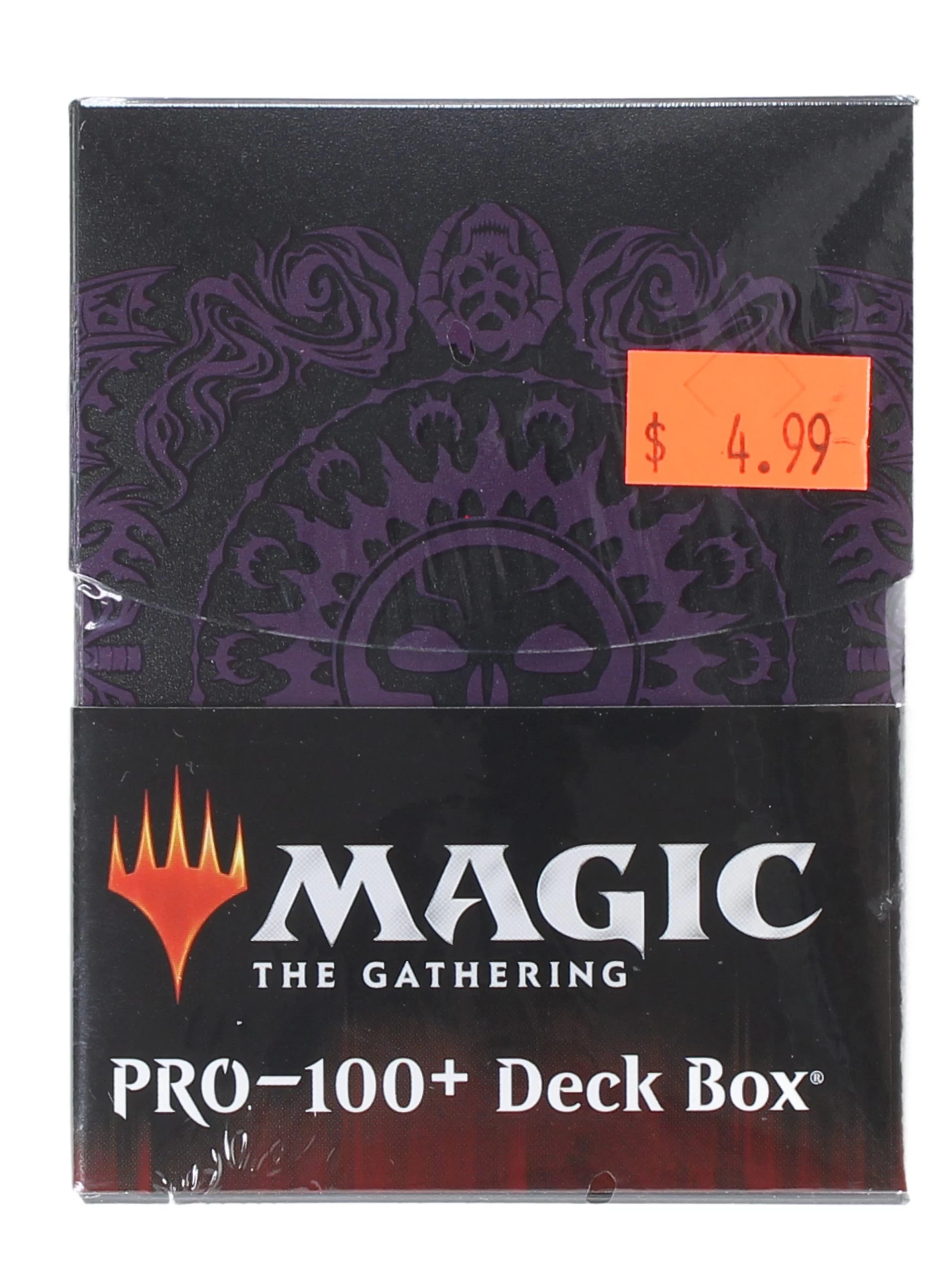 The 100+ Deck Box features vibrant, full-color artwork from Magic: The Gathering and includes a matching deck divider. Made with archival-safe, non-PVC, rigid polypropylene materials, you can store up to 100 double-sleeved cards with confidence. The self-locking lid keeps your cards securely stored when not in use, while also offering easy access. Sized for standard size trading cards.