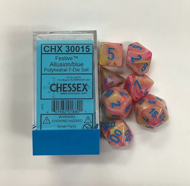 7 set of blacklight reactive festive allusion dice with blue numbers.