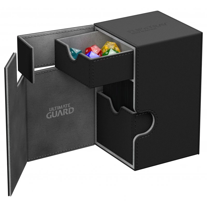 Premium XenoSkin card box with magnetic closure and card and dice trays for the protection and archival safe storage of double-sleeved cards in standard size.