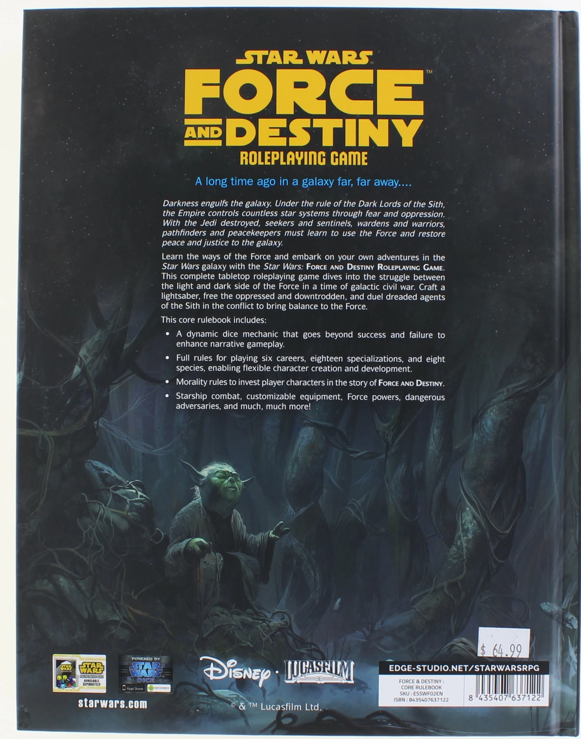 Use the full power of the Force in the epic adventures of the Force and Destiny roleplaying game! You can travel the galaxy in search of ancient Jedi knowledge, protect the downtrodden on your home planet, or pilot a starship for the Rebellion. Whatever your path, the Force and Destiny Core Rulebook contains all the information players and Game Masters need to launch a roleplaying campaign set in the Star Wars universe.