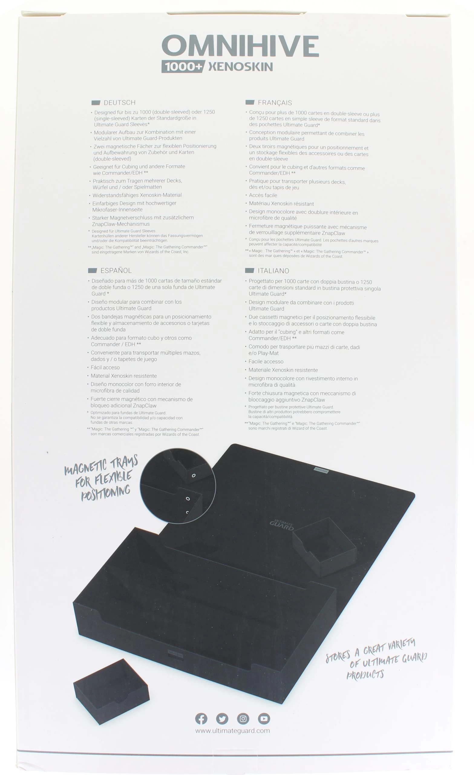 The ultimate spacious and flexible box for storing large collections. This box can hold more than 1000 double- sleeved cards or carry multiple decks and/or Play-Mats plus other Ultimate Guard products like the Sidewinder 133+. Two removable, magnetic, adjustable and stackable trays make this box unique: itÂ’s adaptable for all kinds of games and formats and enables multiple different ways of storing and using your collection.